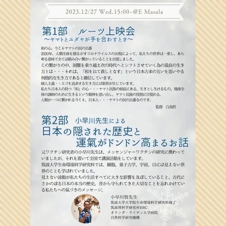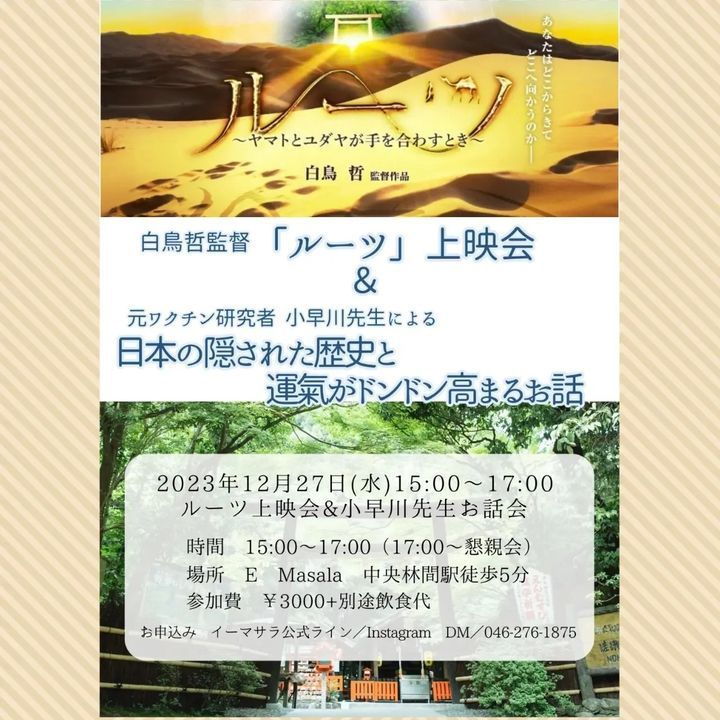 白鳥監督の映画「ルーツ〜ヤマトとユダヤが手を合わすとき〜」上映会と、小早川先生のお話会の2本立てイベントを開催します。