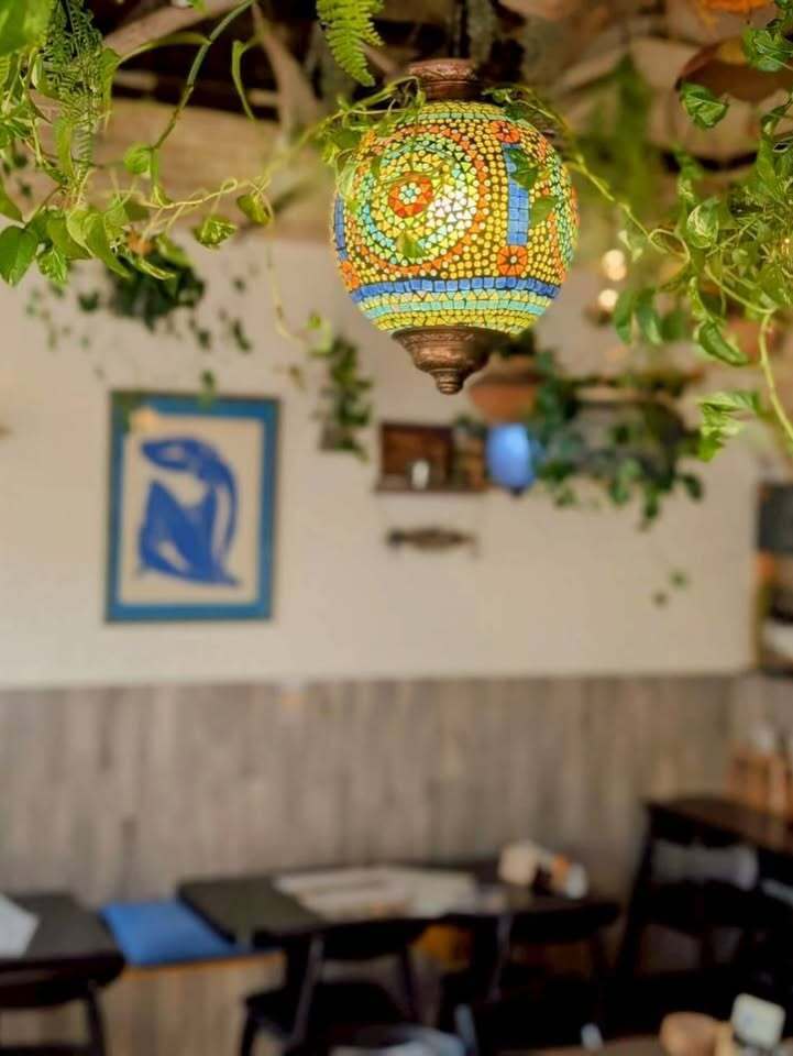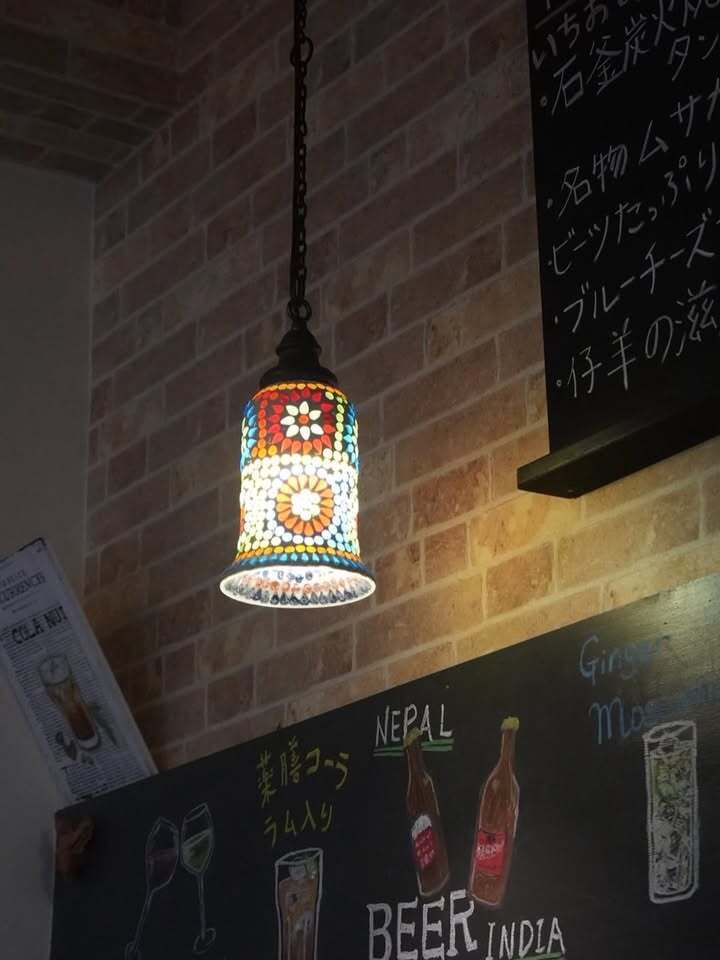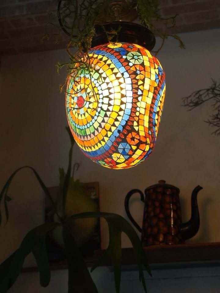 オーナーが国内外で出会った個性豊かなモザイクランプが、イーマサラを照らしてくれています。この写真の他にもあるのでいくつあるかな?あなたはどの子がすきですか?