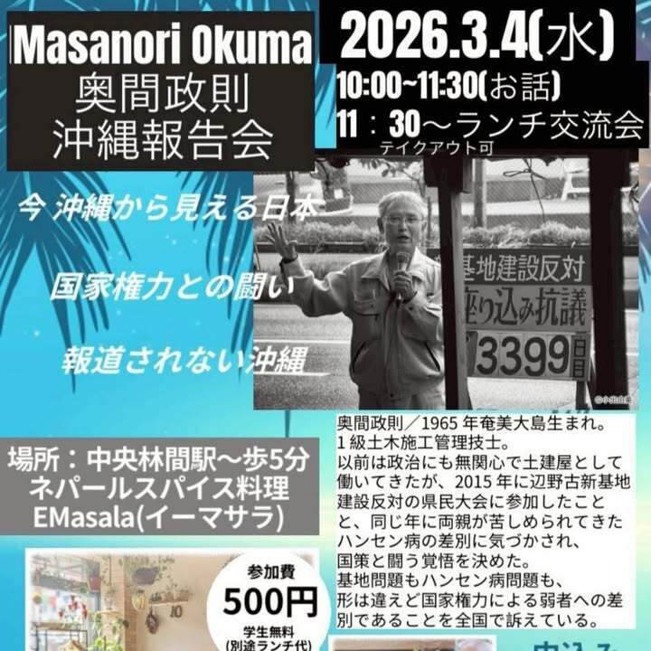 3/4(水)10:00〜 奥間正則・沖縄報告会
