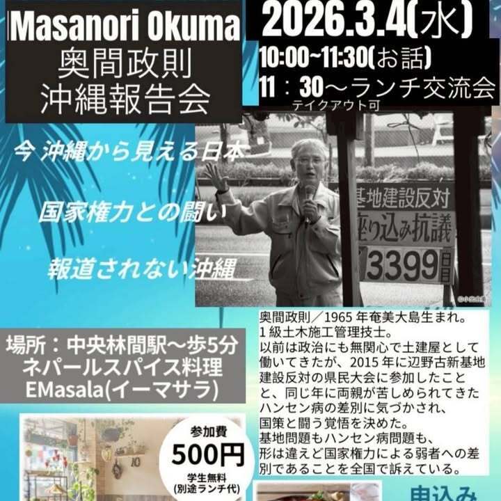 3/4(水)10:00〜 奥間正則・沖縄報告会