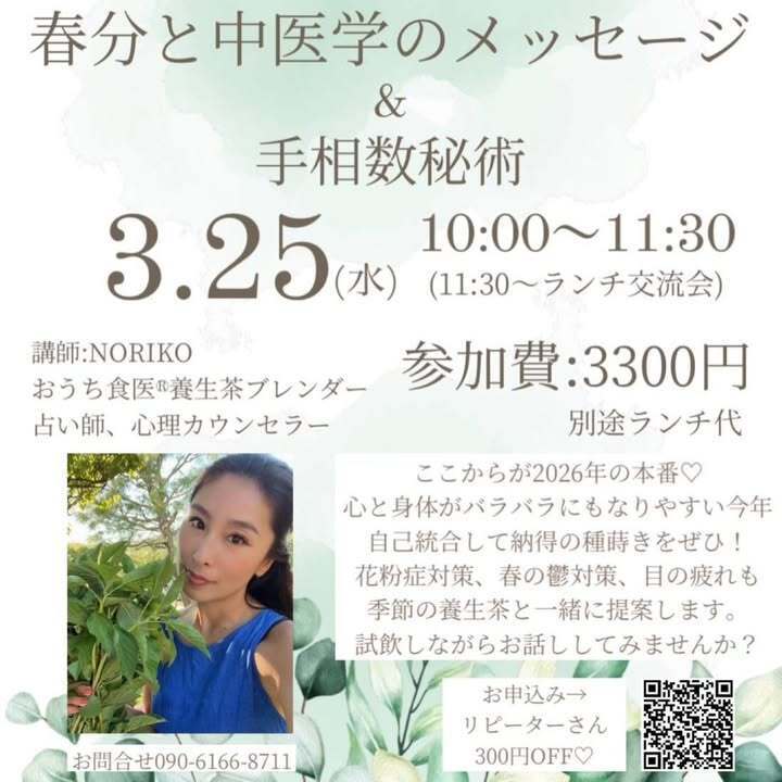 3/25(水)10:00〜 春分と中医学のメッセージ&手相数秘術