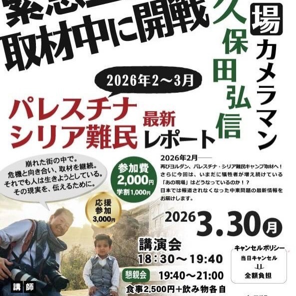 3/30(月)18:30〜 戦場カメラマン久保田さんのパレスチナシリア難民最新レポート