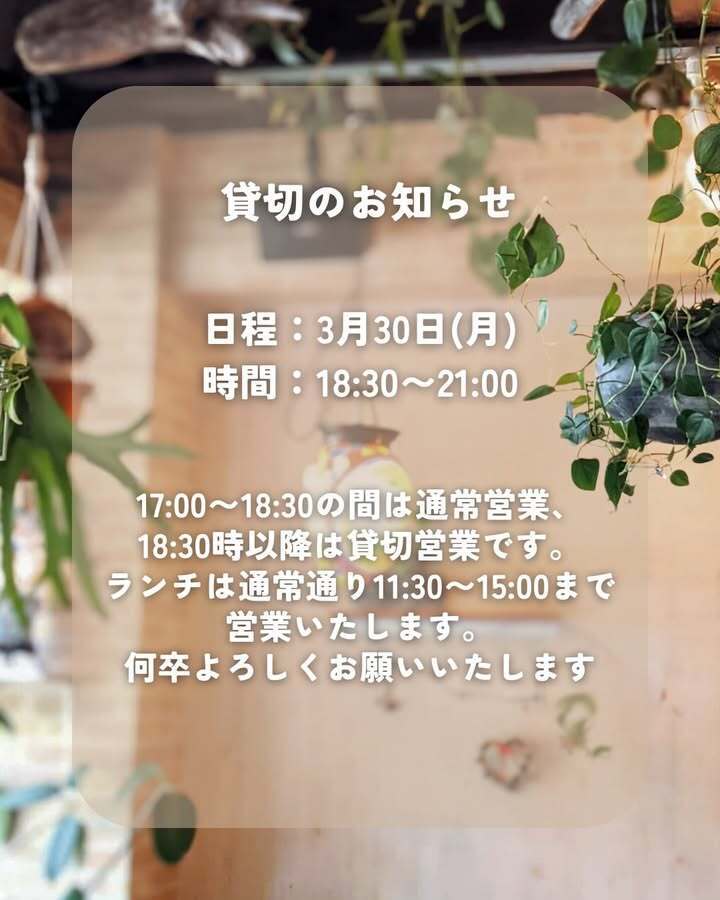 3/30(月)ディナー18:30〜21:00貸切のお知らせ