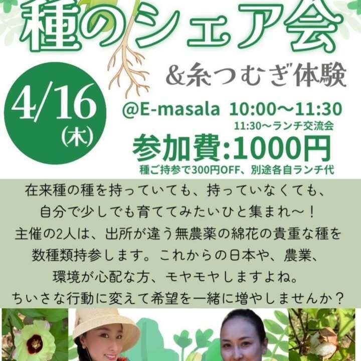 4/16(木)10:00〜 種のシェア会&糸つむぎ体験