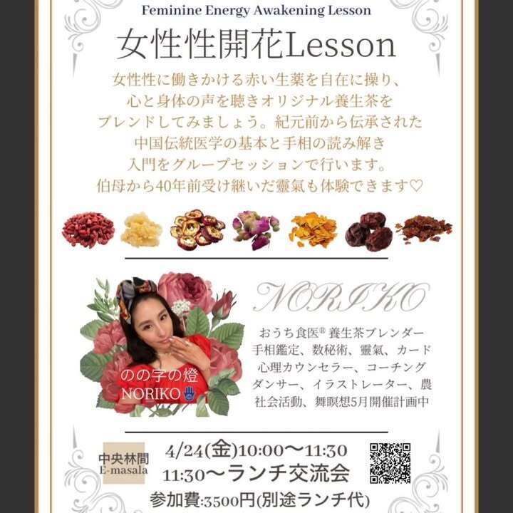 4/24(金)10:00〜 女性性開花Lesson(赤い生薬・手相)